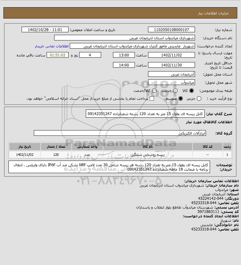 استعلام کابل ریسه ای بطول 15 متر به تعداد 120 رشته شعبانزاده 09142351247, استعلام کابل ریسه ای بطول 15 متر به تعداد 120 رشته شعبانزاده 09142351247