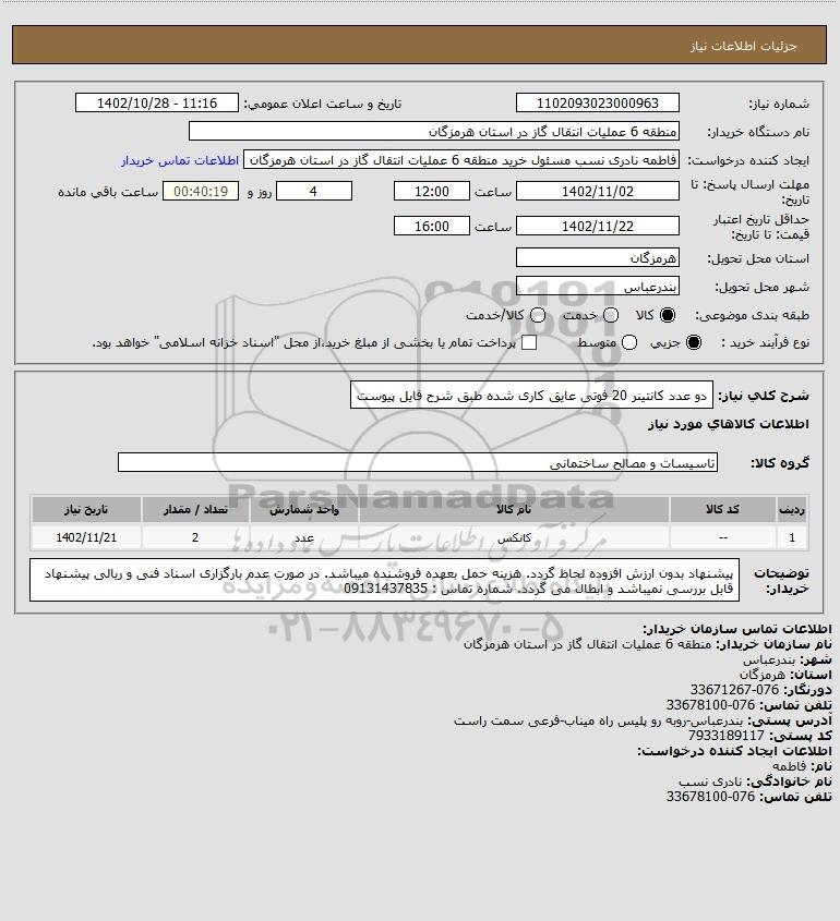 استعلام دو عدد کانتینر 20 فوتی عایق کاری شده طبق شرح فایل پیوست, استعلام دو عدد کانتینر 20 فوتی عایق کاری شده طبق شرح فایل پیوست