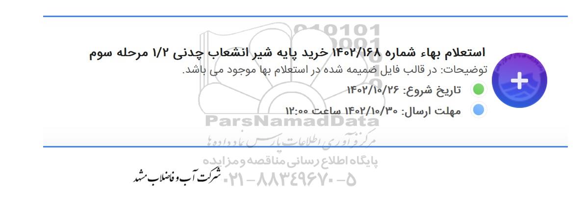 استعلام بهاء شماره 1402.168 خرید پایه شیر انشعاب چدنی 1.2 مرحله سوم