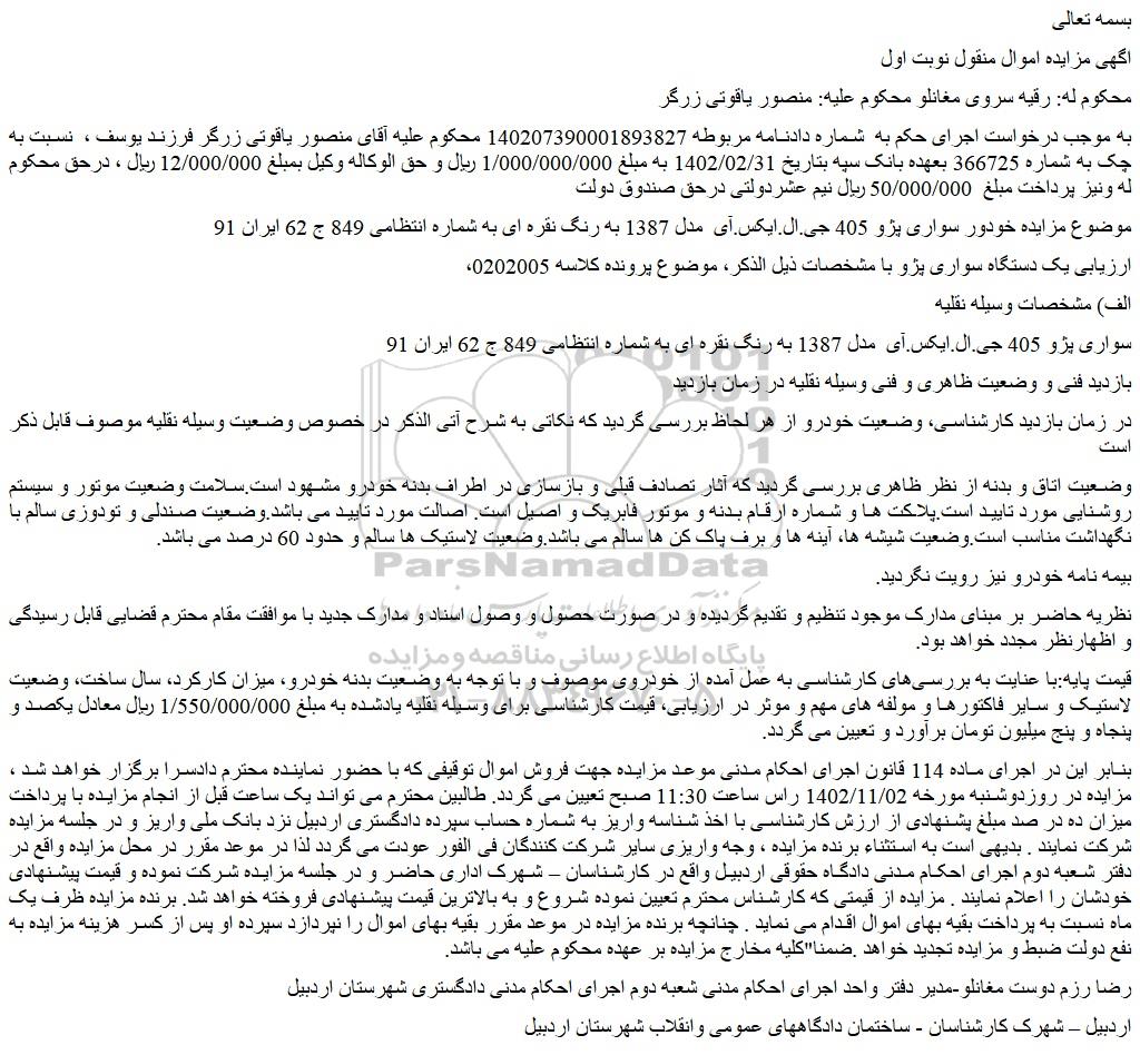 موضوع مزایده خودور سواری پژو 405 جی.ال.ایکس.آی مدل 1387 به رنگ نقره ای به شماره انتظامی 849 ج 62 ایران 91