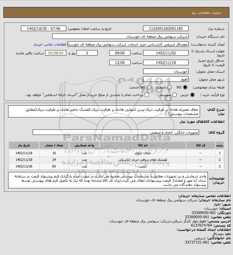 توضیحات خریدار:واحد شمارش و ریز تجهیزات مطابق با مشخصات پیوستی صحیح می باشد.در صورت عدم بارگزاری فرم پیشنهاد قیمت در سامانه ستاد (با مهر و امضاء)، قیمت پیشنهادی ابطال می گردد.ایران کد کالا مشابه بوده که نیاز به تکمیل فرم های پیوستی توسط پیشنهاد دهندگان می باشد.