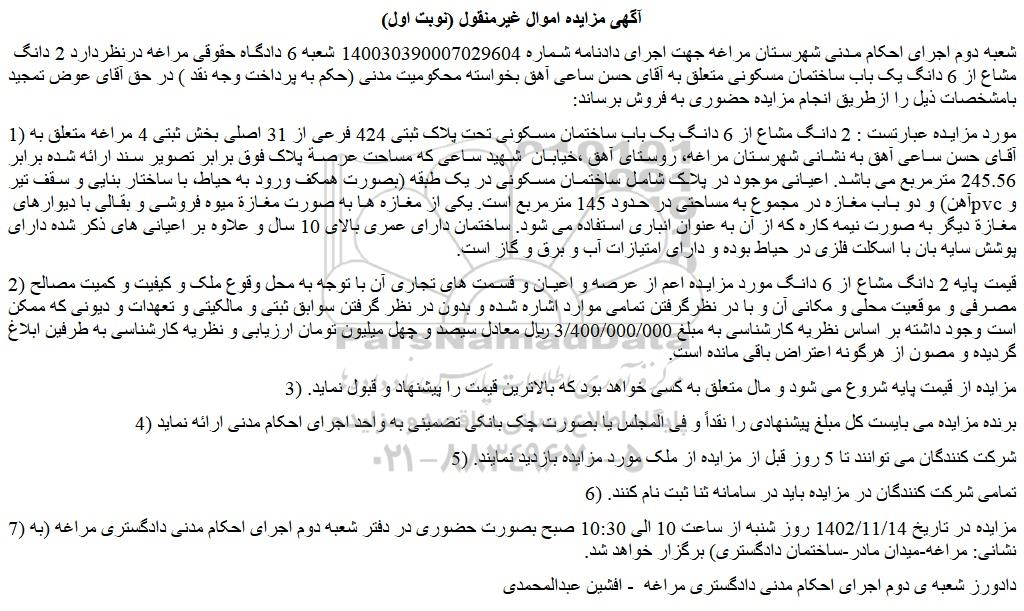 شعبه دوم اجرای احکام مدنی شهرستان مراغه جهت اجرای دادنامه شماره 140030390007029604 شعبه 6 دادگاه حقوقی مراغه درنظردارد 2 دانگ مشاع از 6 دانگ یک باب ساختمان مسکونی متعلق به آقای حسن ساعی آهق بخواسته محکومیت مدنی (حکم به پرداخت وجه نقد ) در حق آقای عوض تمجید بامشخصات ذیل را ازطریق انجام مزایده حضوری به فروش برساند: