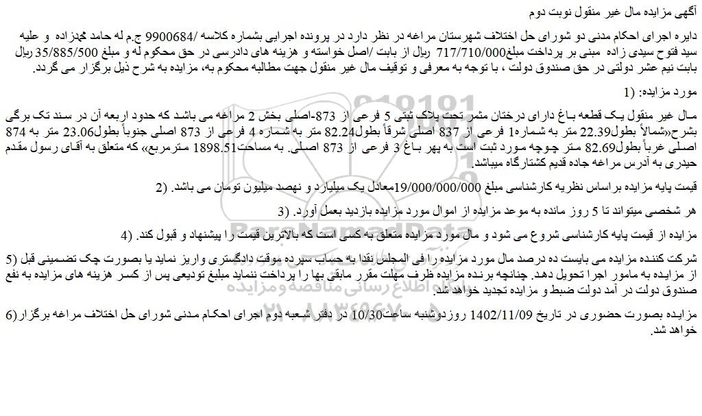 دایره اجرای احکام مدنی دو شورای حل اختلاف شهرستان مراغه در نظر دارد در پرونده اجرایی بشماره کلاسه /9900684 ج.م له حامد محمدزاده و علیه سید فتوح سیدی زاده مبنی بر پرداخت مبلغ717/710/000 ریال از بابت /اصل خواسته و هزینه های دادرسی در حق محکوم له و مبلغ 35/885/500 ریال بابت نیم عشر دولتی در حق صندوق دولت ، با توجه به معرفی و توقیف مال غیر منقول جهت مطالبه محکوم به، مزایده به شرح ذیل برگزار می گردد.
