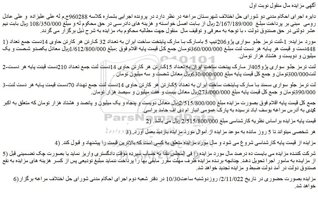 دایره اجرای احکام مدنی دو شورای حل اختلاف شهرستان مراغه در نظر دارد در پرونده اجرایی بشماره کلاسه 960288ج.م له علی علیزاده  و علی عادل رومی  مبنی بر پرداخت مبلغ  2/167/189/000 ریال از بابت اصل خواسته و هزینه های دادرسی در حق محکوم له و مبلغ 108/350/000 ریال بابت نیم عشر دولتی در حق صندوق دولت ، با توجه به معرفی و توقیف مال  منقول جهت مطالبه محکوم به، مزایده به شرح ذیل برگزار می گردد.
