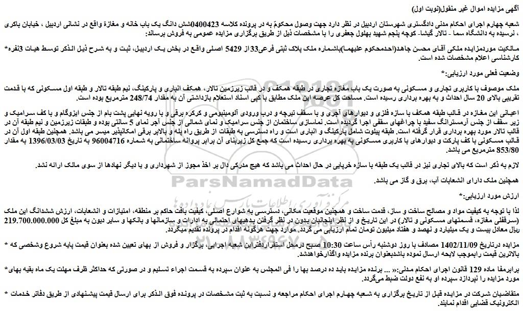 *مالکیت موردمزایده ملکی آقای محسن جاهد(احدمحکوم علیهما)باشماره ملک پلاک ثبتی فرعی33از 5429 اصلی واقع در بخش یک اردبیل، ثبت و به شرح ذیل الذکر توسط هیات 3نفره کارشناسی اعلام مشخصات شده است.