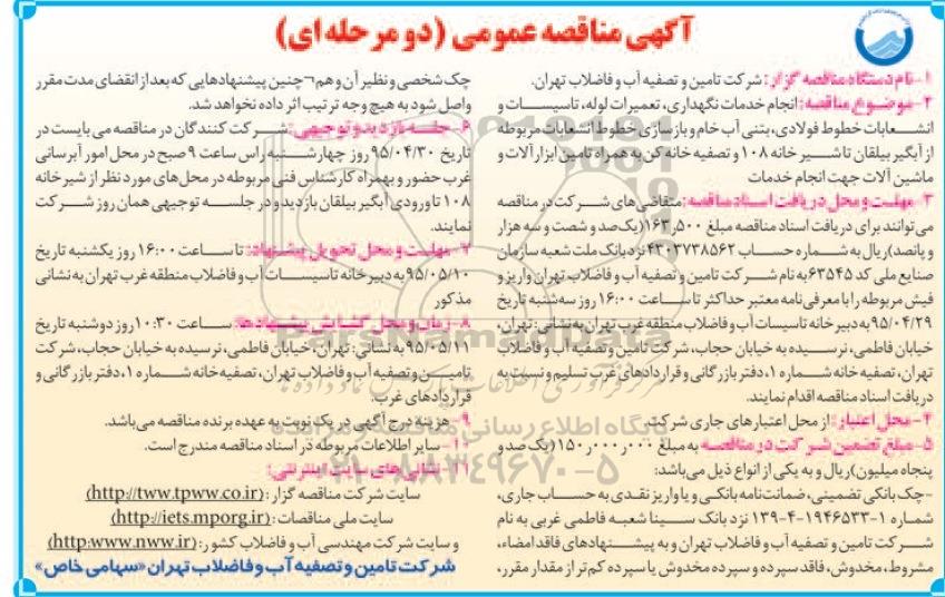 مناقصه انجام خدمات نگهداری، تعمیرات لوله، تأسیسات و انشعابات خطوط لوله فولادی، بتنی آب خام و بازسازی خطوط انشعابات, آگهی مناقصه عمومی, مناقصه انجام خدمات نگهداری، تعمیرات لوله، تأسیسات و انشعابات خطوط لوله فولادی، بتنی آب خام و بازسازی خطوط انشعابات