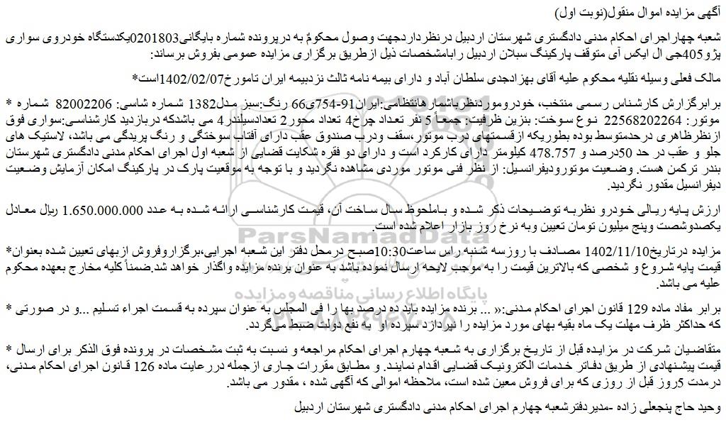 شعبه چهاراجرای احکام مدنی دادگستری شهرستان اردبیل درنظرداردجهت وصول محکومٌ به درپرونده شماره بایگانی0201803یکدستگاه خودروی سواری پژو405جی ال ایکس آی متوقف پارکینگ سبلان اردبیل رابامشخصات ذیل ازطریق برگزاری مزایده عمومی بفروش برساند: