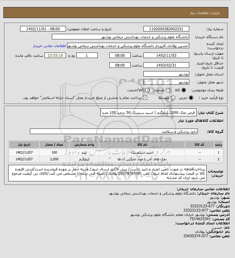 شرح کلی نیاز: قرص نمک 2000 کیلوگرم | اسید سیتریک 50 درصد 100 عدد