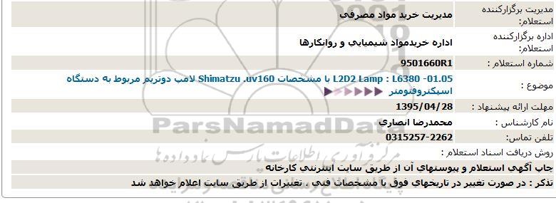 L2D2 Lamp : L6380 -01.05 با مشخصات Shimatzu .uv160 لامپ دوتریم مربوط به دستگاه اسپكتروفتومتر95.4.22 از کلیه افراد متخصص و شرکتها واجد شرایط دعوت به عمل میآید در مناقصه با کد خبرگزاری پارس نماد: 693920 شرکت نمایند.