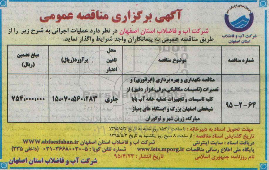 شرکت آب و فاضلاب استان اصفهان در نظر دارد عملیات اجرایی به شرح زیر را از طریق مناقصه عمومی به پیمانکاران واجدشرایط واگذار نماید