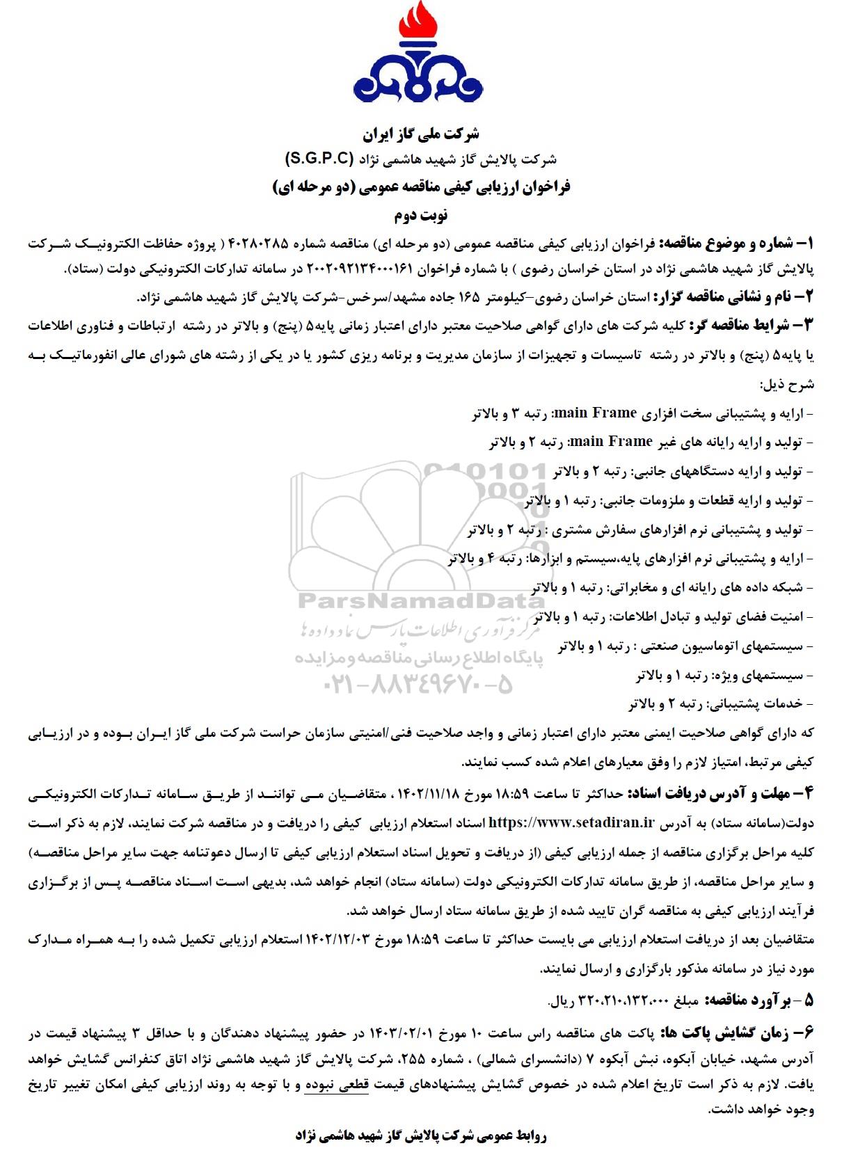 1- شماره و موضوع مناقصه : فراخوان ارزیابی کیفی مناقصه عمومی (دو مرحله ای) مناقصه شماره 40280285 (پروژه حفاظت الکترونیک شرکت پالایش گاز شهید هاشمی نژاد در خراسان خراسان رضوی) با شماره فراخوان 2002092134000161 در سامانه تدارکات الکترونیکی دولت (ستاد).