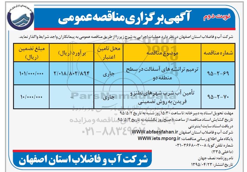 شرکت آب و فاضلاب استان اصفهان در نظر دارد عملیات اجرایی به شرح زیر را از طریق مناقصه عمومی به پیمانکاران واجد شرایط واگذار نماید