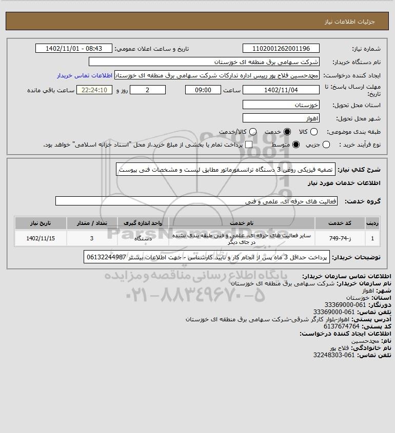 شرح کلی نیاز: تصفیه فیزیکی روغن 3 دستگاه ترانسفورماتور مطابق لیست و مشخصات فنی پیوست