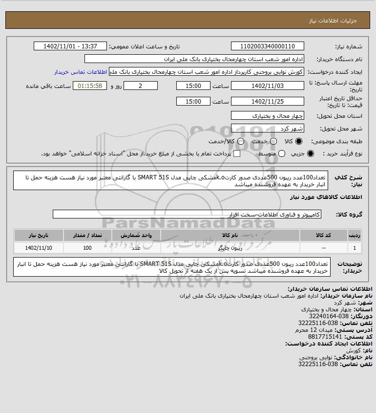 شرح کلی نیاز: تعداد100عدد ریبون 500عددی صدور کارتk.oمشکی چاپی مدل SMART 51S با گارانتی معتبر مورد نیاز هست هزینه حمل تا انبار خریدار به عهده فروشنده میباشد