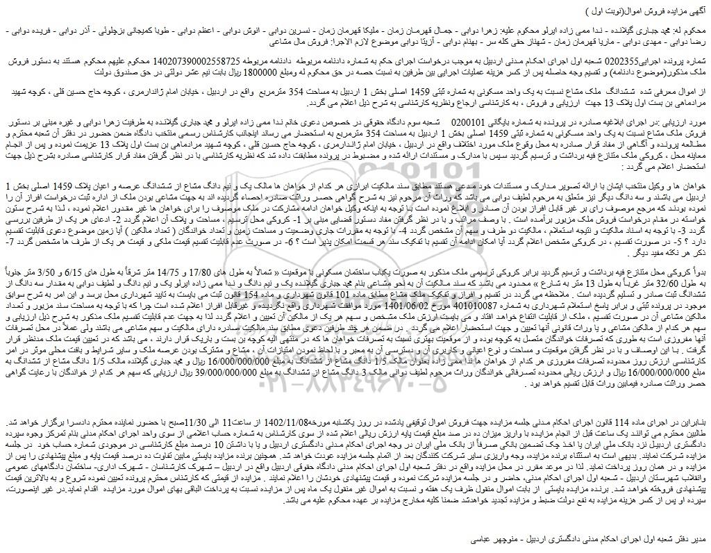 شماره پرونده اجرایی0202355 شعبه اول اجرای احکام مدنی اردبیل به موجب درخواست اجرای حکم به شماره دادنامه مربوطه  دادنامه مربوطه 140207390002558725 محکوم علیهم محکوم هستند به دستور فروش ملک مذکور(موضوع دادنامه) و تقسیم وجه حاصله پس از کسر هزینه عملیات اجرایی بین طرفین به نسبت حصه در حق محکوم له ومبلغ 1800000 ریال بابت نیم عشر دولتی در حق صندوق دولت