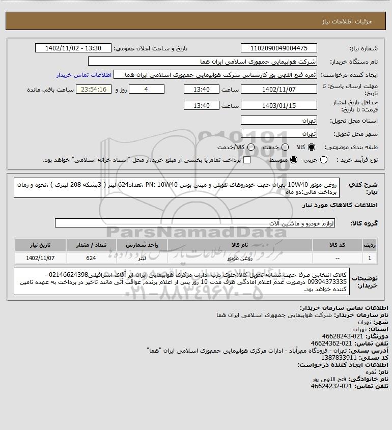 | 1 | -- | روغن موتور | لیتر | 624 | 1402/11/07 |