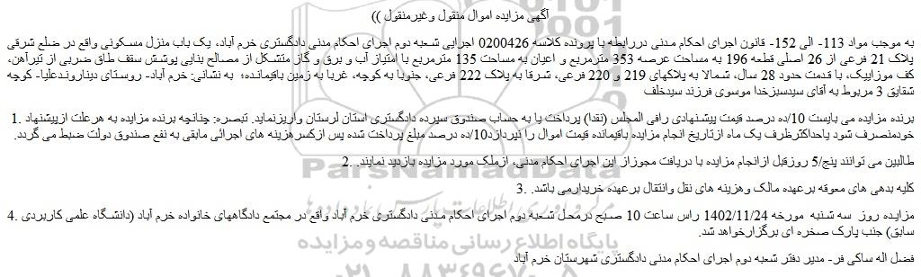 به موجب مواد 113- الی 152- قانون اجرای احکام مدنی دررابطه با پرونده کلاسه 0200426 اجرایی شعبه دوم اجرای احکام مدنی دادگستری خرم آباد، یک باب منزل مسکونی واقع در ضلع شرقی پلاک 21 فرعی از 26 اصلی قطعه 196 به مساحت عرصه 353 مترمربع و اعیان به مساحت 135 مترمربع با امتیاز آب و برق و گاز متشکل از مصالح بنایی پوشش سقف طاق ضربی از تیرآهن، کف موزاییک، با قدمت حدود 28 سال، شمالا به پلاکهای 219 و 220 فرعی، شرقا به پلاک 222 فرعی، جنوبا به کوچه، غربا به زمین باقیمانده؛ به نشانی: خرم آباد- روستای دیناروندعلیا- کوچه شقایق 3 مربوط به آقای سیدسبزخدا موسوی فرزند سیدخلف