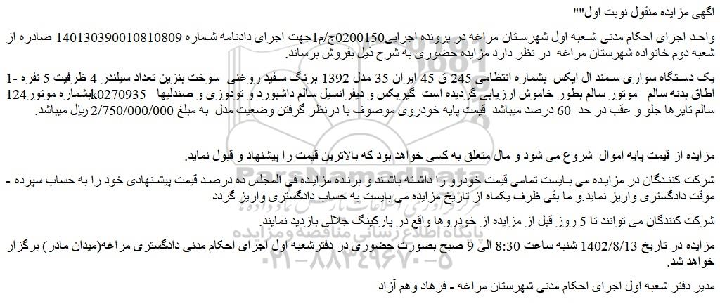 مزایده در تاریخ 1402/8/13 شنبه ساعت 8:30 الی 9 صبح بصورت حضوری در دفترشعبه اول اجرای احکام مدنی دادگستری مراغه(میدان مادر) برگزار خواهد شد.