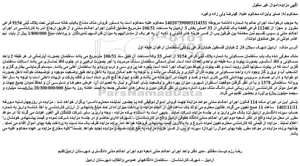 به موجب درخواست اجرای حکم به شماره دادنامه مربوطه 140207390003114331 محکوم علیه محکوم است به دستور فروش ملک مشاع یکباب خانه مسکونی تحت پلاک ثبتی 9154 فرعی مفروز و مجزا از 11246 فرعی قطعه یک تفکیکی از 33 اصلی بخش 3 اردبیل به مساحت 106/51 مترمربع مطابق قانون اجرای احکام مدنی و از طریق ارجاع امر به کارشناسی در اجرای احکام مدنی و سپس تقسیم ثمن معامله بین طرفین پس از کسر هزینه های قانونی و تادیه آن به هر یک از مشارالیهم به میزان قدرالسهم نامبردگان و پرداخت مبلغ 1/800/000 ریال از بابت نیم عشر دولتی در حق صندوق دولت//.