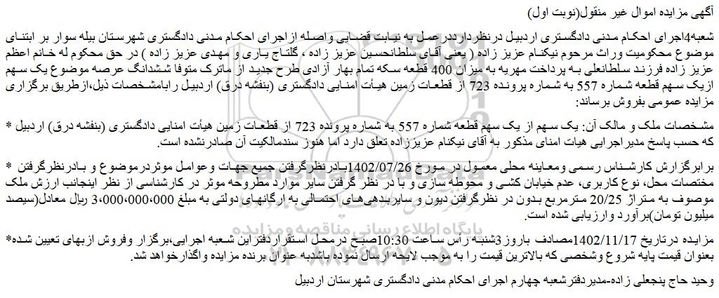 شعبه4اجرای احکام مدنی دادگستری اردبیل درنظردارددرعمل به نیابت قضایی واصله ازاجرای احکام مدنی دادگستری شهرستان بیله سوار بر ابتنای موضوع محکومیت وراث مرحوم نیکنام عزیز زاده ( یعنی آقای سلطانحسین عزیز زاده ، گلتاج یاری و مهدی عزیز زاده ) در حق محکوم له خانم اعظم عزیز زاده فرزند سلطانعلی به پرداخت مهریه به میزان 400 قطعه سکه تمام بهار آزادی طرح جدید از ماترک متوفا ششدانگ عرصه موضوع یک سهم ازیک سهم قطعه شماره 557 به شماره پرونده 723 از قطعات زمین هیأت امنایی دادگستری (بنفشه درق) اردبیل رابامشخصات ذیل،ازطریق برگزاری مزایده عمومی بفروش برساند: