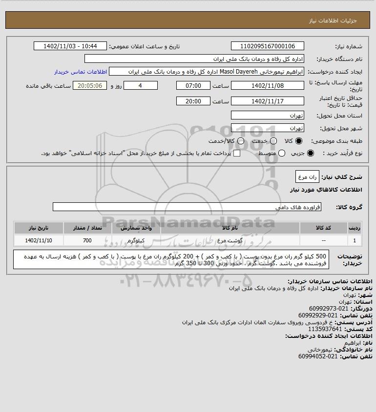 توضیحات خریدار:500 کیلو گرم ران مرغ بدون پوست ( با کعب و کمر ) + 200 کیلوگرم ران مرغ با پوست ( با کعب و کمر ) هزینه ارسال به عهده فروشنده می باشد .گوشت گرم ، حدود وزنی 300 تا 350 گرم