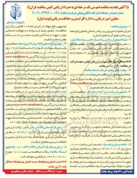 شماره ثبت در سامانه تدارکات الکترونیکی دولت ستاد): 2002003292000048 معاون امور دریایی اداره کل ایمنی و حفاظت دریایی (نوبت اول)