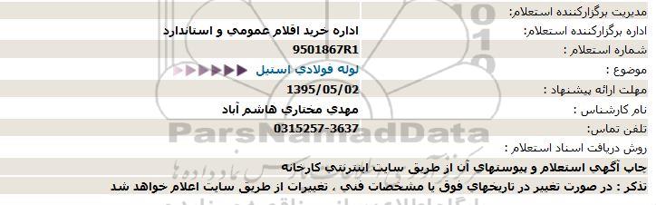 استعلام بها و موضوع استعلام استعلام لوله فولادی استیل به اطلاع کلیه شرکتها و افراد متخصص واجد شرایط میرساند، آگهی گذار در نظر دارد از طریق استعلام بها، نسبت به انتخاب و دریافت پیشنهادات اقدام نماید. این استعلام با کد آگهی ثبت شده در سامانه خبرگزاری پارس نماد : 696142 منتشر شده است. مشخصات استعلام : تاریخ شروع استعلام: 1395/04/27 آخرین مهلت ارسال پیشنهاد قیمت : 1395/05/02 و محل اجرای پروژه : استان اصفهان میباشد. استعلام قیمت مورد درخواست : استعلام لوله فولادی استیل با دستهبندیهای تخصصی و گروه های مرتبط : قطعات استنلس استیل, لوله و اتصالات, لوله های فولادی و چدنی, استعلام اطلاع رسانی میگردد.