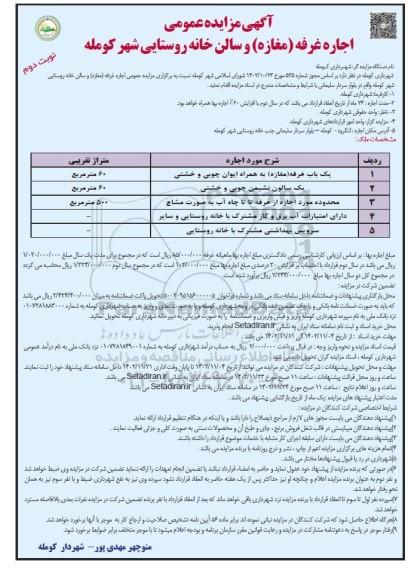 مزایده اجاره غرفه (مغازه) و سالن خانه روستایی نوبت دوم