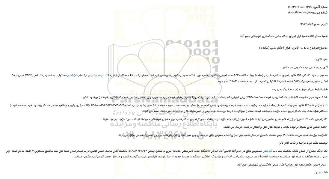 به موجب مواد 113 الی 145 قانون اجرای احکام مدنی در رابطه با پرونده کلاسه 0200564- اجرایی صادره از شعبه اول دادگاه عمومی حقوقی شهرستان خرم آباد  فروش یک د انگ مشاع از شش دانگ عرصه و اعیان  یک باب آپارتمان مسکونی  به شماره پلاک ثبتی 4537 فرعی از 45  اصلی  مفروز و مجزی از 4530 قطعه شماره 2 تفکیکی ناحیه ندارد  به  مساحت 298/59 متر مربع