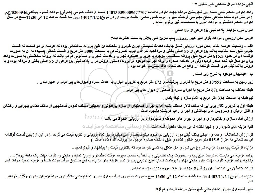 واحد اجرای احکام مدنی شعبه اول شهرستان مراغه جهت اجرای دادنامه 140130390009677707 شعبه 3 دادگاه عمومی (حقوقی) مراغه شماره بایگانی0200946/ج.م 1 در نظر دارد ملک مشاعی متعلق بهموسی فرهنگ مهر و ایوب خسروشاهی جلسه مزایده ای در تاریخ1402/11/24 روز سه شنبه ساعت 12 الی 12:30صبح در محل اجرای احکام دادگستری مراغه اموال با مشخصات ذیل برگزار نماید .