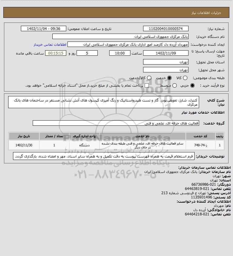 شرح کلی نیاز: کنترل، شارژ، تعویض پودر، گاز و تست هیدرواستاتیک و رنگ آمیزی کپسول های آتش نشانی مستقر در ساختمان های بانک مرکزی