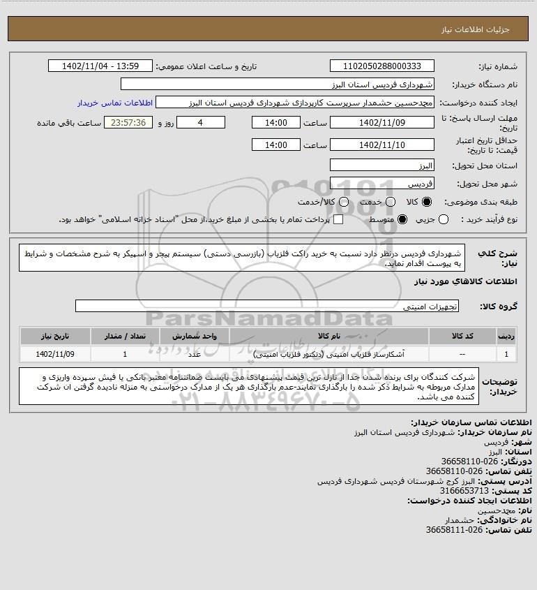 شرح کلی نیاز: شهرداری فردیس درنظر دارد نسبت به خرید راکت آشکارساز فلز (بازرسی دستی) سیستم پیجر و اسپیکر به شرح مشخصات و شرایط به پیوست اقدام نماید.