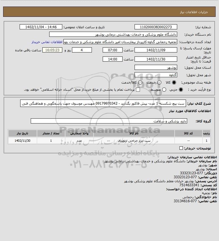 نام دستگاه خریدار:دانشگاه علوم پزشکی و خدمات بهداشتی درمانی بوشهر