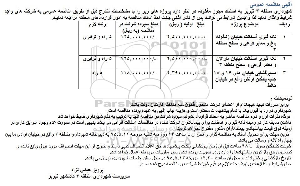 شهرداری منطقه 3 تبریز در نظر دارد پروژه های زیر را با مشخصات مندرج ذیل از طریق مناقصه عمومی به شرکت های واجد شرایط واگذار نماید. لذا واجدین شرایط می توانند پس از نشر آگهی جهت اخذ اسناد مناقصه به امور قراردادهای منطقه مراجعه نمایند.