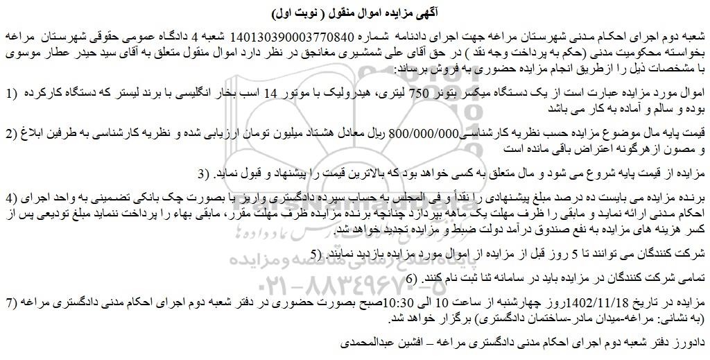 شعبه دوم اجرای احکام مدنی شهرستان مراغه جهت اجرای دادنامه شماره 140130390003770840 شعبه 4 دادگاه عمومی حقوقی شهرستان مراغه بخواسته محکومیت مدنی (حکم به پرداخت وجه نقد ) در حق آقای علی شمشیری مغانجق در نظر دارد اموال منقول متعلق به آقای سید حیدر عطار موسوی با مشخصات ذیل را ازطریق انجام مزایده حضوری به فروش برساند: