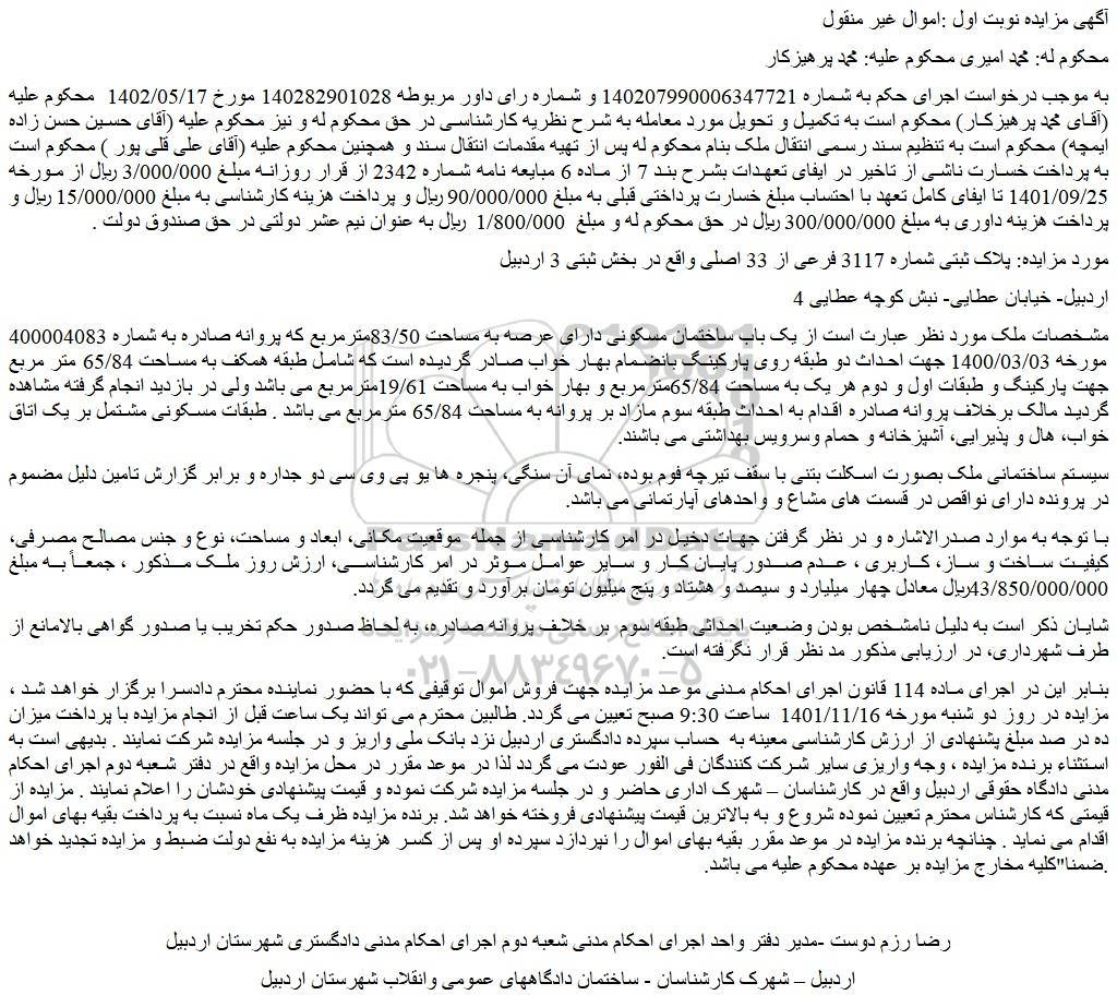 بنابر این در اجرای ماده 114 قانون اجرای احکام مدنی موعد مزایده جهت فروش اموال توقیفی که با حضور نماینده محترم دادسرا برگزار خواهد شد ، مزایده در روز دو شنبه مورخه 1401/11/16 ساعت 9:30 صبح تعیین می گردد. طالبین محترم می تواند یک ساعت قبل از انجام مزایده با پرداخت میزان ده در صد مبلغ پشنهادی از ارزش کارشناسی معینه به حساب سپرده دادگستری اردبیل نزد بانک ملی واریز و در جلسه مزایده شرکت نمایند . بدیهی است به استثناء برنده مزایده ، وجه واریزی سایر شرکت کنندگان فی الفور عودت می گردد لذا در موعد مقرر در محل مزایده واقع در دفتر شعبه دوم اجرای احکام مدنی دادگاه حقوقی اردبیل واقع در کارشناسان – شهرک اداری حاضر و در جلسه مزایده شرکت نموده و قیمت پیشنهادی خودشان را اعلام نمایند . مزایده از قیمتی که کارشناس محترم تعیین نموده شروع و به بالاترین قیمت پیشنهادی فروخته خواهد شد. برنده مزایده ظرف یک ماه نسبت به پرداخت بقیه بهای اموال اقدام می نماید . چنانچه برنده مزایده در موعد مقرر بقیه بهای اموال را نپردازد سپرده او پس از کسر هزینه مزایده به نفع دولت ضبط و مزایده تجدید خواهد .ضمنا"کلیه مخارج مزایده بر عهده محکوم علیه می باشد.