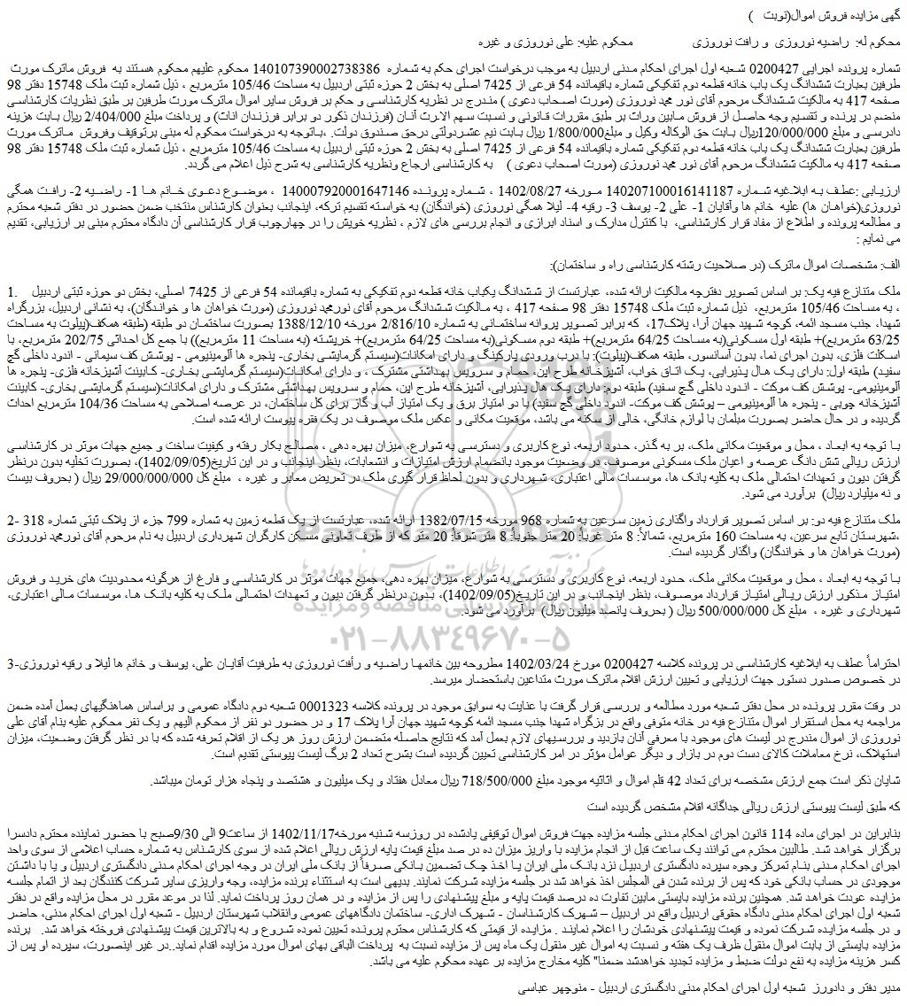 شماره پرونده اجرایی 0200427 شعبه اول اجرای احکام مدنی اردبیل به موجب درخواست اجرای حکم به شماره  140107390002738386 محکوم علیهم محکوم هستند به  فروش ماترک مورث طرفین بعبارت ششدانگ یک باب خانه قطعه دوم تفکیکی شماره باقیمانده 54 فرعی از 7425 اصلی به بخش 2 حوزه ثبتی اردبیل به مساحت 105/46 مترمربع ، ذیل شماره ثبت ملک 15748 دفتر 98 صفحه 417 به مالکیت ششدانگ مرحوم آقای نور محمد نوروزی (مورث اصحاب دعوی ) مندرج در نظریه کارشناسی و حکم بر فروش سایر اموال ماترک مورث طرفین بر طبق نظریات کارشناسی منضم در پرنده و تقسیم وجه حاصل از فروش مابین وراث بر طبق مقررات قانونی و نسبت سهم الارث آنان (فرزندان ذکور دو برابر فرزندان اناث) و پرداخت مبلغ 2/404/000 ریال بابت هزینه دادرسی و مبلغ 120/000/000ریال بابت حق الوکاله وکیل و مبلغ1/800/000 ریال بابت نیم عشردولتی درحق صندوق دولت. ،باتوجه به درخواست محکوم له مبنی برتوقیف وفروش  ماترک مورث طرفین بعبارت ششدانگ یک باب خانه قطعه دوم تفکیکی شماره باقیمانده 54 فرعی از 7425 اصلی به بخش 2 حوزه ثبتی اردبیل به مساحت 105/46 مترمربع ، ذیل شماره ثبت ملک 15748 دفتر 98 صفحه 417 به مالکیت ششدانگ مرحوم آقای نور محمد نوروزی (مورث اصحاب دعوی )    به کارشناسی ارجاع ونظریه کارشناسی به شرح ذیل اعلام می گردد.