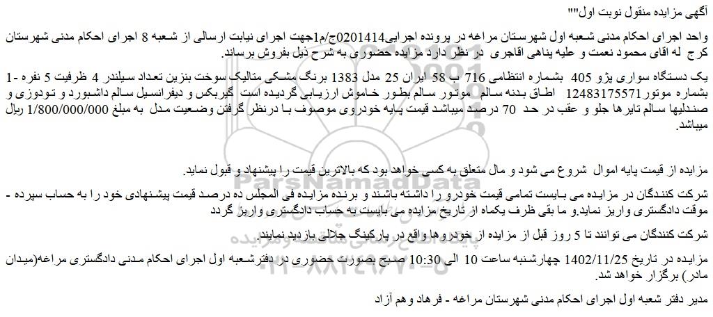 واحد اجرای احکام مدنی شعبه اول شهرستان مراغه در پرونده اجرایی0201414ج/م1جهت اجرای نیابت ارسالی از شعبه 8 اجرای احکام مدنی شهرستان کرج  له اقای محمود نعمت و علیه پناهی اقاجری  در نظر دارد مزایده حضوری به شرح ذیل بفروش برساند.