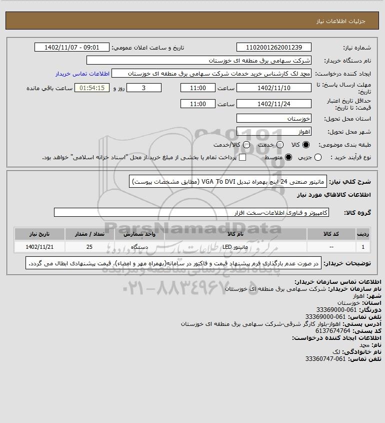 شرح کلی نیاز: مانیتور صنعتی 24 اینچ بهمراه تبدیل VGA To DVI (مطابق مشخصات پیوست)