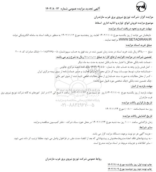 مزایده عمومی مزایده فروش انواع لوازم و اثاثیه اداری اسقاط برگزار میگردد. از کلیه افراد متخصص و شرکت‌های واجد شرایط دعوت به عمل می‌آید تا در این مزایده با کد خبرگزاری پارس نماد : 6978412 شرکت نمایند تاریخ شروع مزایده : 1402/11/07 مهلت شرکت در مزایده: تا پایان روز 1402/11/12 مکان برگزاری اموال واگذاری استان‌های مازندران و دسته‌بندی‌های مربوط به این حراجی متفرقه میباشد.