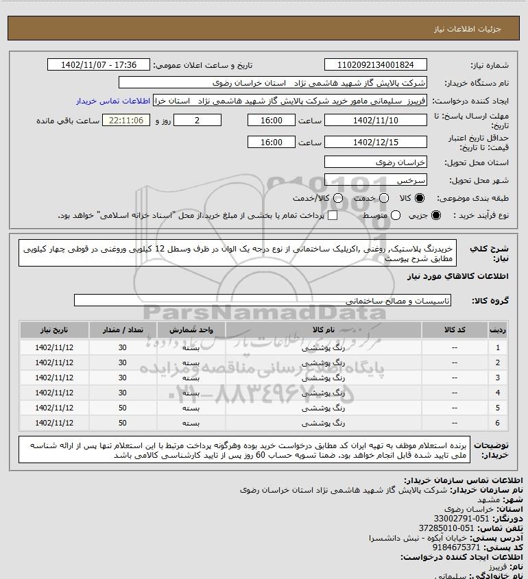 نام دستگاه خریدار:شرکت پالایش گاز شهید هاشمی نژاد استان خراسان رضوی