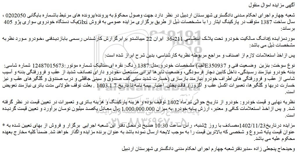 شعبه چهارم اجرای احکام مدنی دادگستری شهرستان اردبیل در نظر دارد جهت وصول محکومٌ به پرونده/پرونده های مرتبط باشماره بایگانی 0202050 ، یک دستگاه خودروی سواری پژو 405 Glxi سال ساخت 1387 متوقف در پارکینگ ایثار را با مشخصات ذیل از طریق برگزاری مزایده عمومی به فروش برساند: