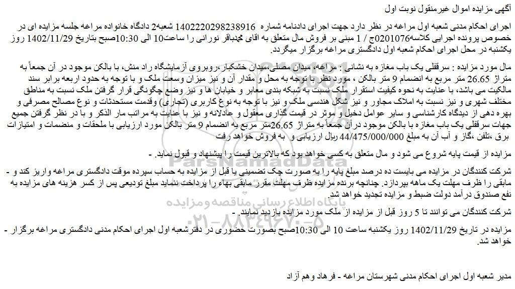 - مزایده در تاریخ 1402/11/29 روز یکشنبه ساعت 10 الی 10:30صبح بصورت حضوری در دفترشعبه اول اجرای احکام مدنی دادگستری مراغه برگزار خواهد شد.