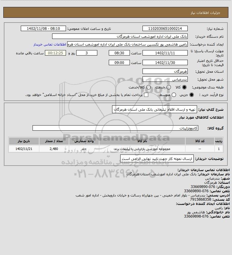 شرح کلی نیاز: تهیه و ارسال اقلام تبلیغاتی بانک ملی استان هرمزگان