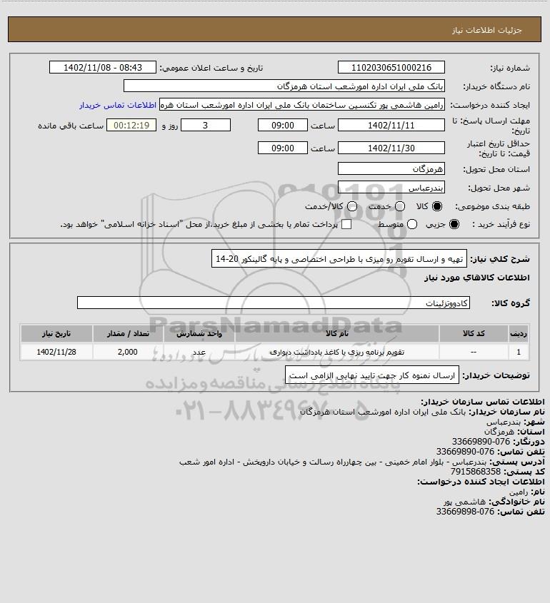 شرح کلی نیاز: تهیه و ارسال تقویم رو میزی با طراحی اختصاصی و پایه گالینکور 20-14