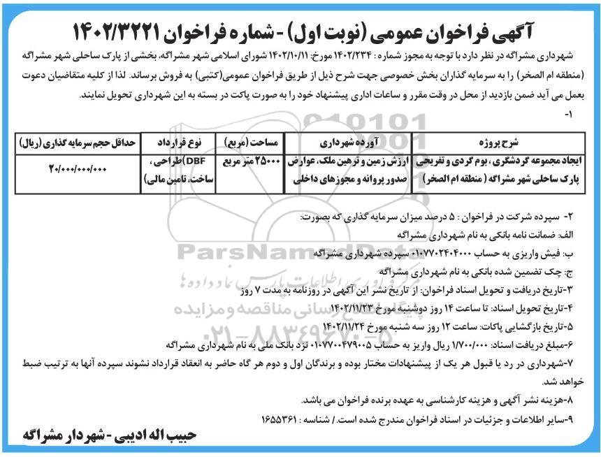شهرداری مشراگه در نظر دارد با توجه به مجوز شماره : 1402/234 مورخ 1402.10.11 شورای اسلامی شهر مشراگه بخشی از پارک ساحلی شهر مشراگه (منطقه ام الصخر) را به سرمایه گذاران بخش خصوصی جهت شرح ذیل از طریق فراخوان عمومی (کتبی) به فروش برساند. لذا از کلیه متقاضیان دعوت بعمل می آید ضمن بازدید از محل در وقت مقرر و ساعات اداری پیشنهاد خود را به صورت پاکت در بسته به این شهرداری تحویل نمایند.
