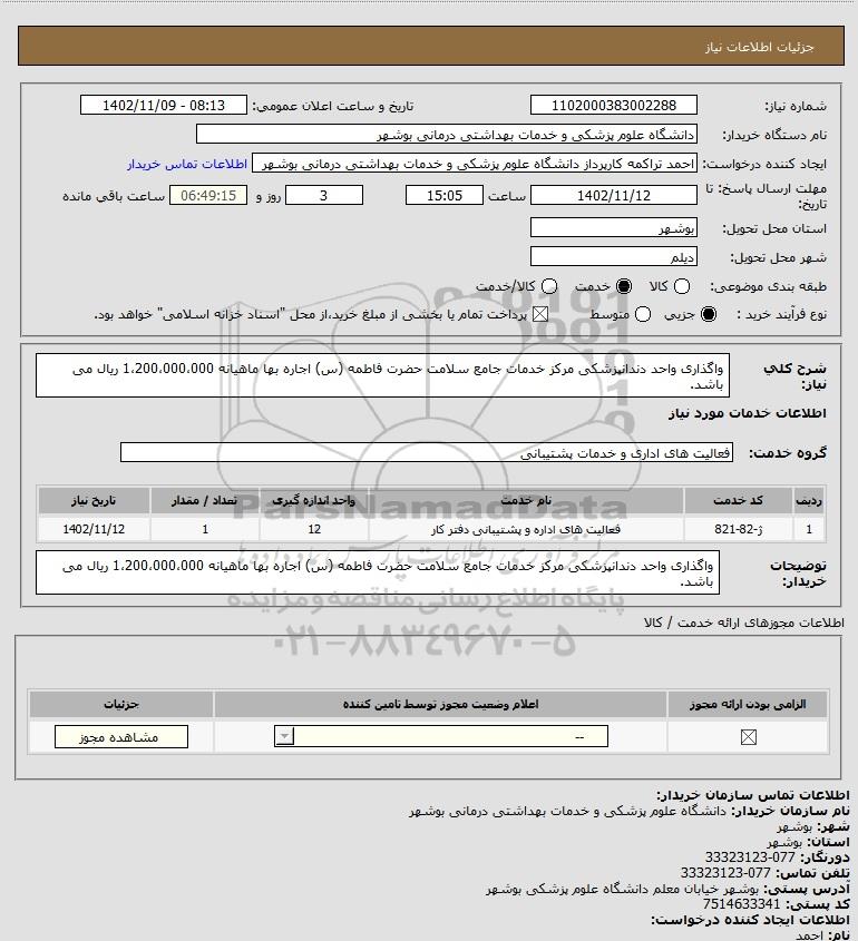 توضیحات خریدار:واگذاری واحد دندانپزشکی مرکز خدمات جامع سلامت حضرت فاطمه (س) اجاره بها ماهیانه 1،200،000،000 ریال می باشد.