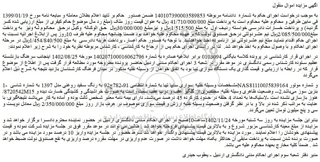 بنابراین جلسه مزایده به روز سه شنبه مورخه 1402/11/24ساعت10صبح در اجرای احکام مدنی دادگستری اردبیل در حضور نماینده محترم دادسرا برگزار خواهد شد و مزایده از مبلغ معینه کارشناسی مزبور شروع و به بالاترین قیمت پیشنهادی فروخته خواهد شد . طالبین می توانند در موعد مقرر فوق در جلسه مزایده شرکت نموده و قیمت پیشنهادی خودشان را اعلام نمایند . مورد مزایده به بالاترین قیمت پیشنهادی واگذار خواهد شد شرط حضور در جلسه مزایده واریز 10 درصد مورد مزایده می باشد و در صورت برنده شدن نسبت به پرداخت مابقی آن حداکثر یکماه مهلت خواهد داشت در صورت عدم واریزی در مهلت مقرره درصد واریزی به نفع صندوق دولت ضبط خواهد شد . ضمناً کلیه مخارج بعهده محکوم علیه می باشد.