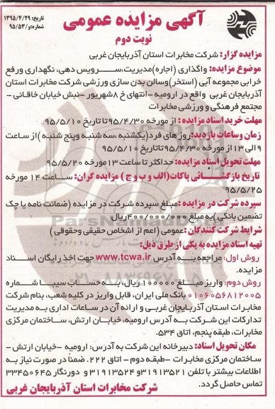 موضوع مزایده: واگذاری (اجاره) مدیریت، سرویس دهی، نگهداری و رفع خرابی مجموعه آبی (استخر) و سالن بدن سازی ورزشی شرکت مخابرات استان آذربایجان غربی واقع در ارومیه- انتهای خ 8 شهریور- نبش خیابان خاقانی- مجتمع فرهنگی و ورزشی مخابرات