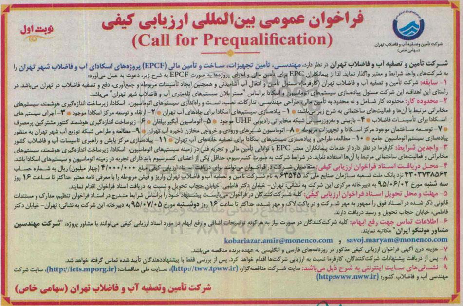 شرکت تامین و تصفیه آب و فاضلاب تهران در نظر دارد، مهندسی، تأمین تجهیزات، ساخت و تأمین مالی (EPCF) پروژه های اسکادای آب و فاضلاب شهر تهران را به شرکت های واجد شرایط و معتبر واگذار نماید لذا از پیمانکاران EPC برای تأمین مالی و اجرای پروژه ها به صورت EPCF به شرح زیر دعوت به عمل آورد: